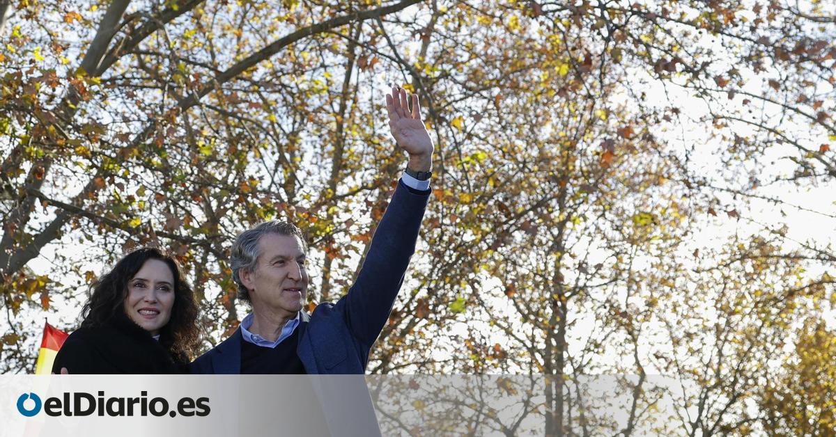 El líder del PP, Alberto Núñez Feijóo, ha reunido este domingo a miles de personas en Madrid para pedir elecciones anticipada ante los escándalos de corrupción que acorralan al Gobierno y al PSOE. Junto a la presidenta de Madrid, Isabel Díaz Ayuso, han pedido que Pedro Sánchez convoque ya a las urnas. Y ambos han copiado el argumento de Miguel Ángel Rodríguez de que el presidente acabará en prisión tras sus dos secretarios de Organización: “Pronto será Sánchez. Lo sabe toda España y todo el PSOE. Cuatro cogieron ese coche para llegar al poder, y tres ya están en la cárcel. Falta 'el uno', el presidente del Gobierno”.
