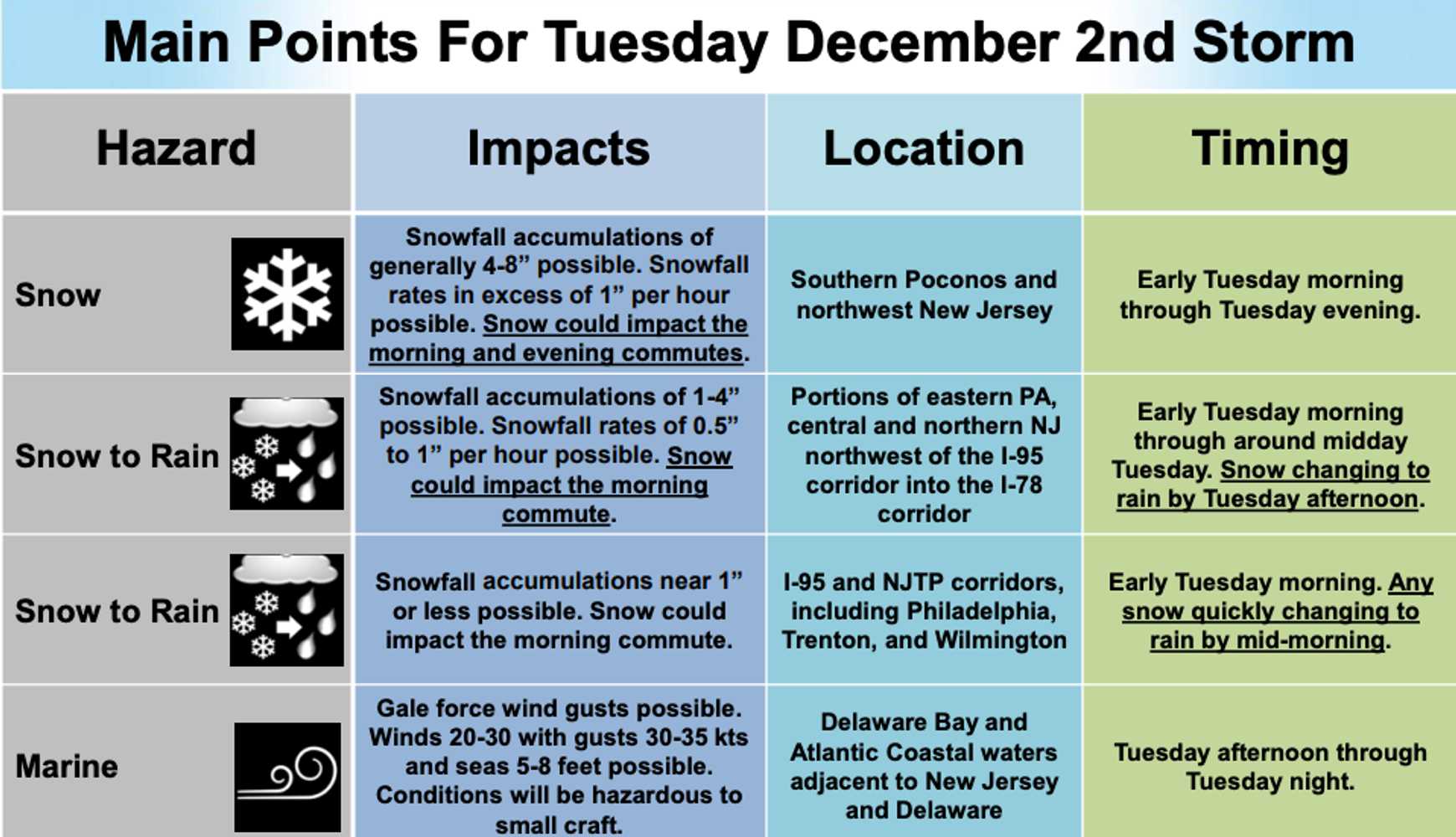 A winter storm is expected to bring snow, rain, and hazardous travel to parts of New Jersey and Pennsylvania on Tuesday, according to a National Weather Service briefing issued Sunday, Nov. 30.
