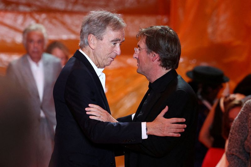 FILE PHOTO: Bernard Arnault, Chairman and Chief Executive Officer of LVMH Moet Hennessy Louis Vuitton, and Pietro Beccari, Chairman and CEO of Louis Vuitton, greet each other at the end of Louis Vuitton Spring/Summer 2024 Women's ready-to-wear collection show during Paris Fashion Week in Paris, France, October 2, 2023. REUTERS/Stephanie Lecocq/File Photo