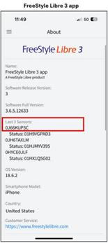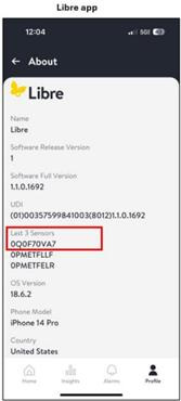 In the Libre app, navigate to the bottom menu and select "Profile" and then "About." Locate the sensor serial number under the "Last 3 Sensors" section.