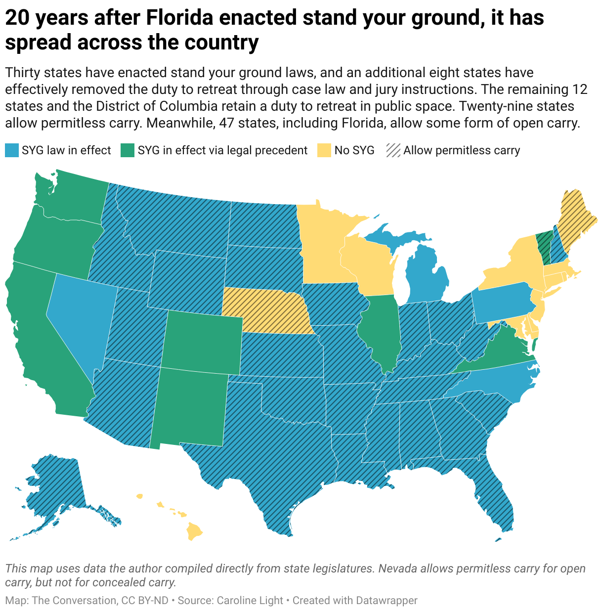 Two decades later, stand your ground laws have spread, in various forms, to 38 states. While 30 states have legislatively enacted stand your ground statutes like Florida’s, eight others implement stand your ground through case law and jury instructions that effectively remove the duty to retreat.