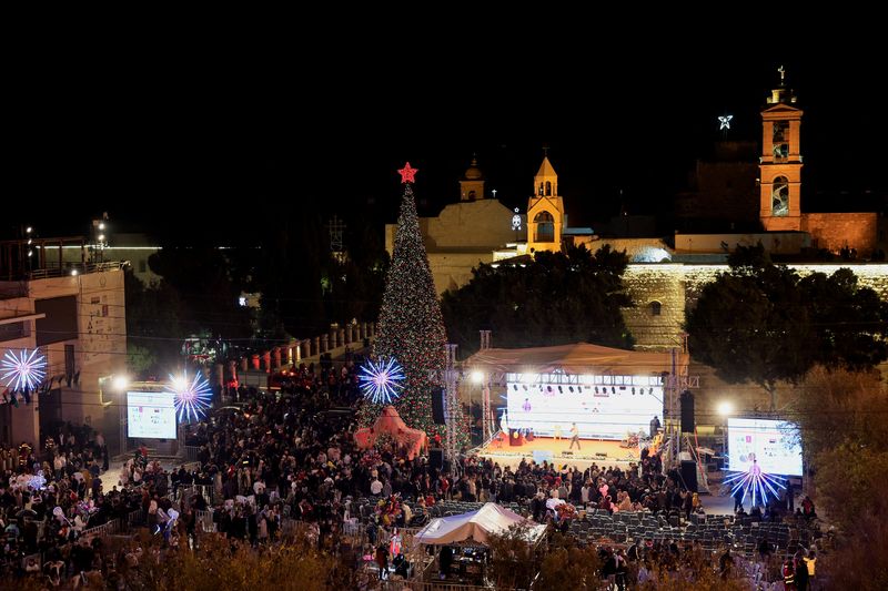 BETHLEHEM, West Bank, Dec 6 (Reuters) - A giant Christmas tree adorned with red and gold baubles stands in the West Bank city of Bethlehem for the first time since 2022.