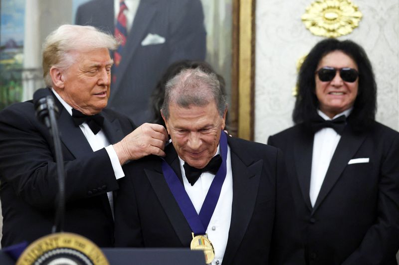 In the Oval Office on Saturday, Trump praised this year's honorees and gave them newly designed gold medallions with blue ribbons, rather than the rainbow-colored ribbons used since 1978 to represent the spectrum of performing arts.