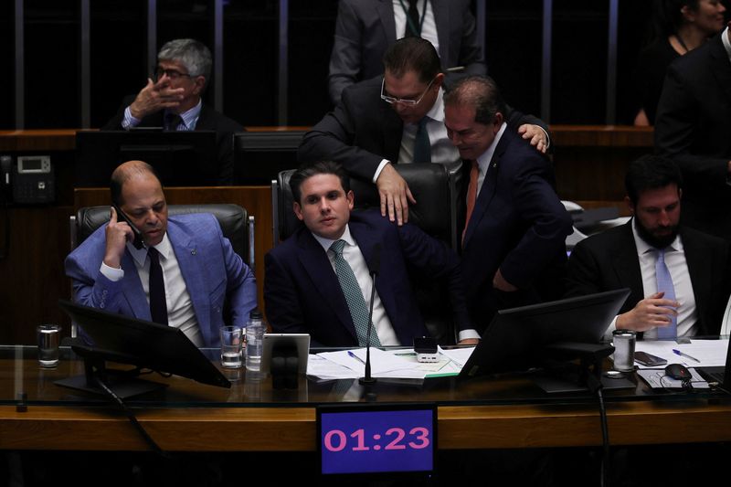 President of the Chamber of Deputies Hugo Motta listens to the federal deputy Sostenes Cavalcante and Paulinho da Forca during a session to vote on a bill, which proposes reducing the sentences for January 8, 2023, riot convictions, including former President Jair Bolsonaro, at the Chamber of Deputies in Brasilia, Brazil, December 10, 2025. REUTERS/Adriano Machado