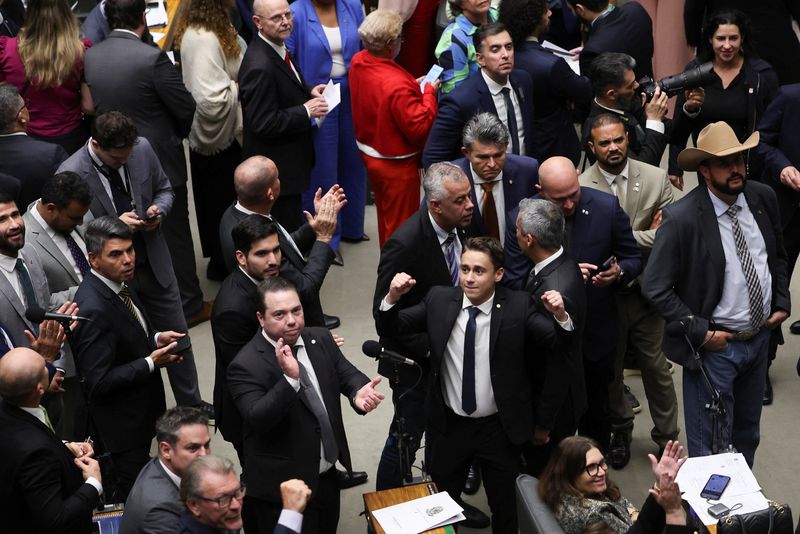 Members of Congress and supporters of former President Jair Bolsonaro react during a session to vote on a bill, which proposes reducing the sentences for January 8, 2023, riot convictions, including former President Jair Bolsonaro, at the Chamber of Deputies in Brasilia, Brazil, December 10, 2025. REUTERS/Adriano Machado
