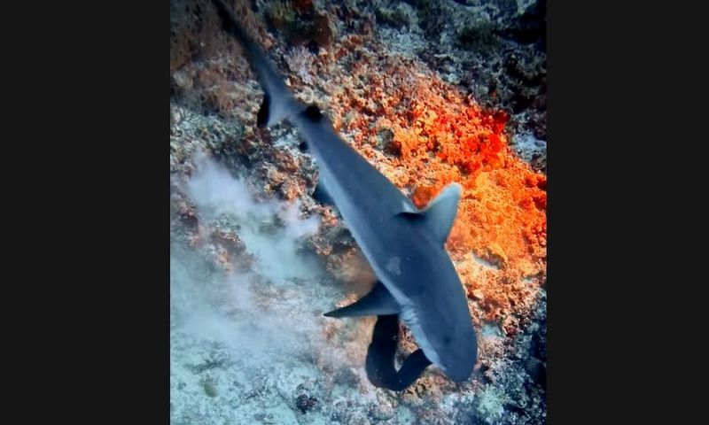 Schweigler captured footage of the shark coming out of nowhere and attacking the larger eel, allowing the smaller eel to escape and scaring the rockfish away.