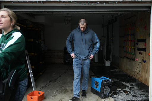 Todd Hinderman, right, and wife Marielle Hinderman, left, walk out of their garage after the lower level of their home flooded after heavy rains in the region Saturday, Dec. 13, 2025, in Burlington, Wash. (AP Photo/Lindsey Wasson)