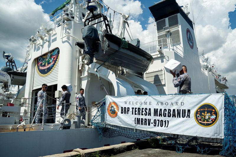 Members of the Philippine Coast Guard (PCG) carry medical supplies on board of BRP Teresa Magbanua following the 6.9 magnitude earthquake in Cebu province, at the PCG Headquarters in Manila, Philippines, October 1, 2025. REUTERS/Lisa Marie David
