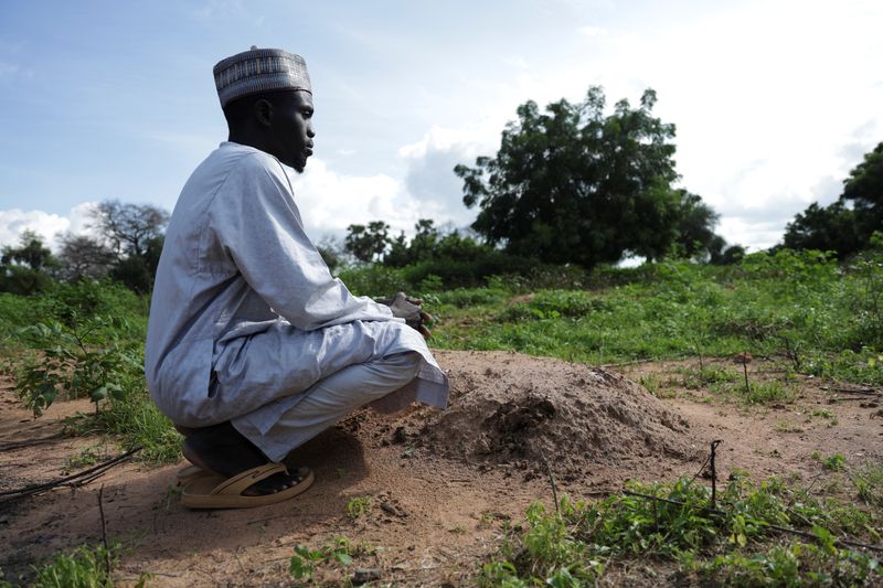 Alhadji Madou Goni kneels near the grave of Mohamat, his nine-month-old son, who died of complications from malaria, in Bogo, Cameroon September 4, 2025. REUTERS/Desire Danga Essigue