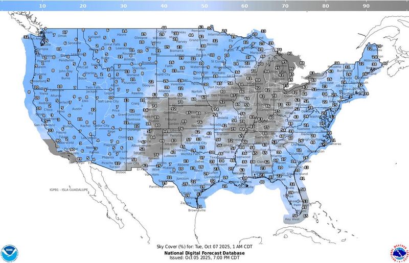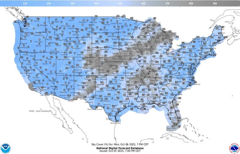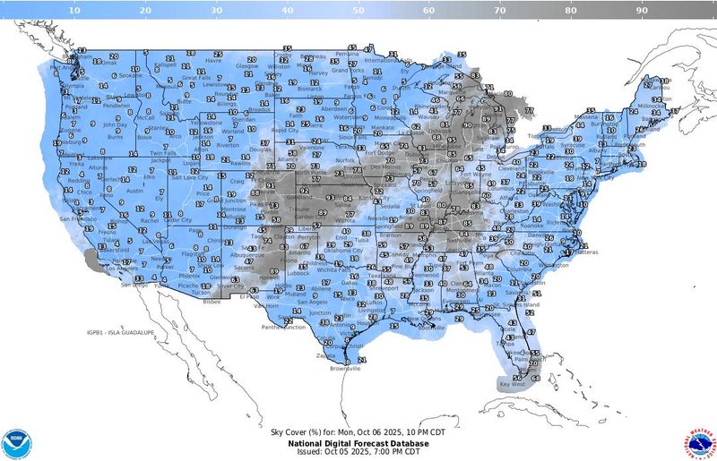 As of Sunday, Oct. 5, the National Weather Service is predicting that most of the U.S. will have clear skies between 8 p.m. ET on Monday, Oct. 6, and 2 a.m. ET Tuesday, Oct. 7, but it will be cloudy in some areas.