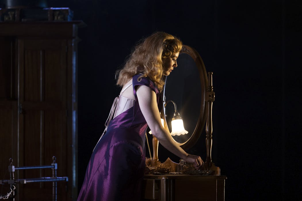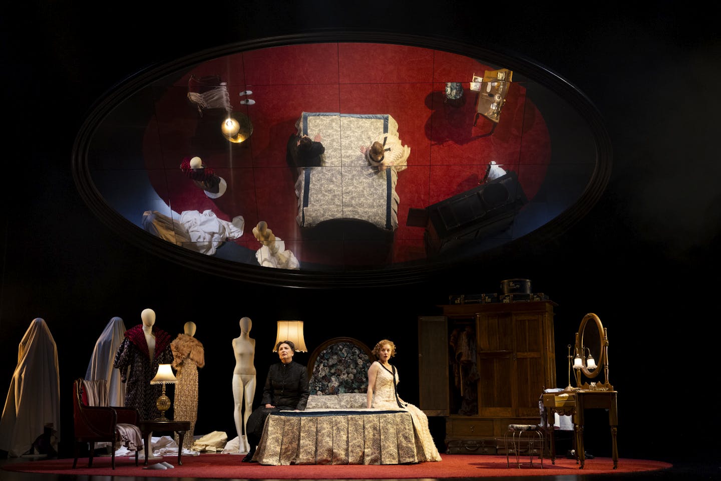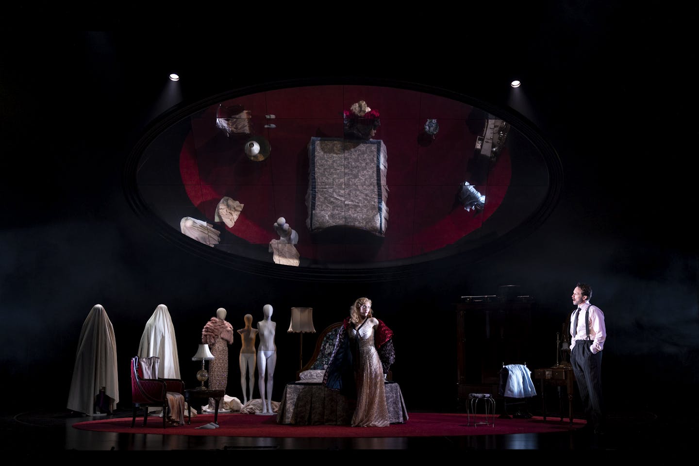 Visually and structurally, the staging leans into Gothic and cinematic modes. There are shifting sets, sliding doors, and blackouts that create a visual sense of abyss and emptiness. An enormous oval mirror, hung from the ceiling, also plays a central role.