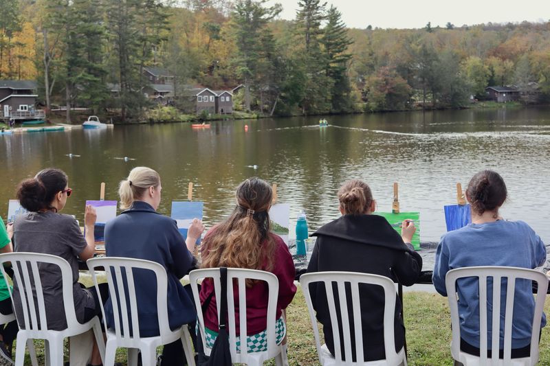 Just beyond them, a 3D block letter sculpture overlooking Lenape Lake spells out CAMP SOCIAL in shades of pastel pink, orange, red and yellow, flanked by barrels spilling over with magenta and red flowers.