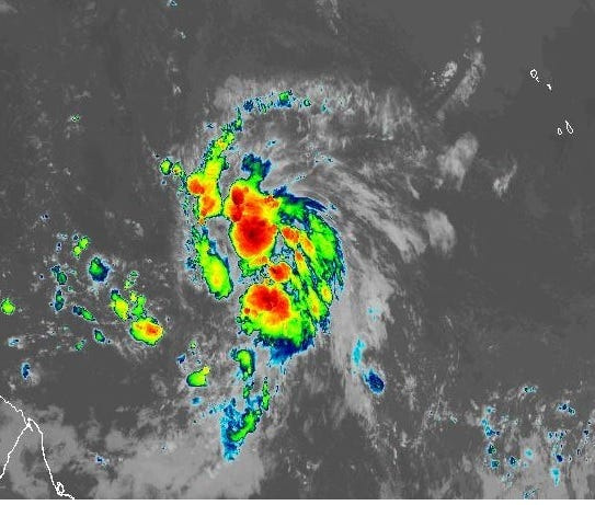 The area of disturbed weather likely to become Jerry is moving quickly west-northwestward across the central tropical Atlantic. In an early Oct. 7 forecast, the hurricane center put the chances of storm formation at 80% over 48 hours and 90% over seven days.