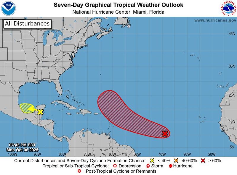 Early on the morning of Oct. 7, the low pressure area likely to produce Jerry was about 1,500 miles east of the Windward Islands on the eastern end of the Caribbean Sea, said the National Hurricane Center.