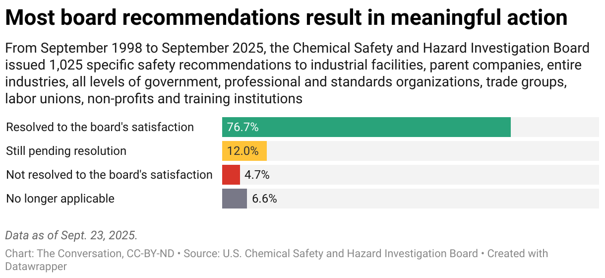 As scholars of chemical disasters, we believe this absence – and the potential for the board to be eliminated entirely under the proposed 2026 federal budget – raises the risk of more, and more serious, chemical disasters, not just in the U.S. but around the world.
