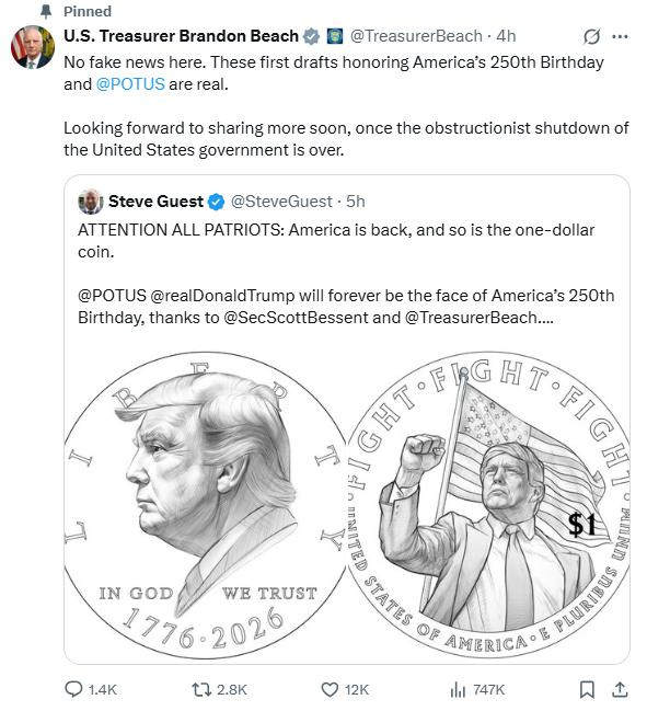 - His fist-pumping image on U.S. currency? The Treasury Department is considering minting new $1 coins bearing Trump's profile on one side and the defiant image after an assassination attempt on the other. One hurdle: an 1866 law that bars using the image of someone who is still alive.
