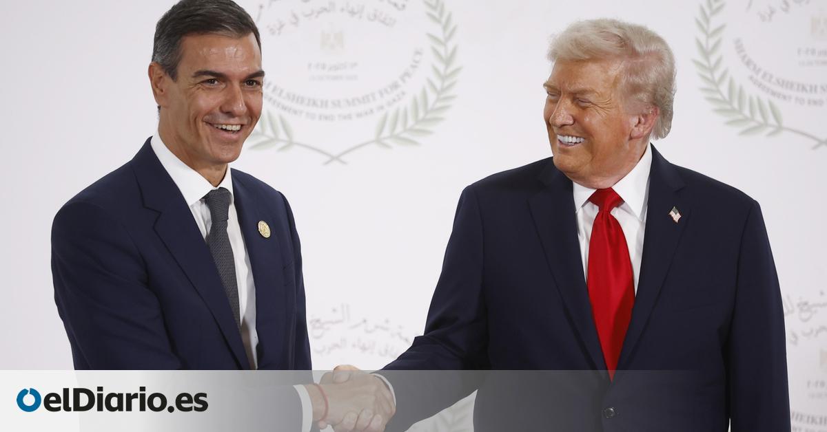El líder estadounidense ha pronunciado estas palabras en la localidad de Sharm El Sheij (Egipto) donde ha tenido lugar la firma de la paz. Previamente, Trump y Sánchez se han saludado con normalidad. El gesto llamaba la atención porque llegó solo unos días después de que Trump propusiera expulsar a España de la OTAN por no alcanzar ese 5% de incremento del gasto militar.