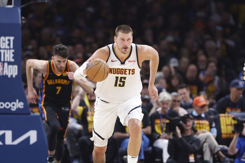 May 5, 2025; Oklahoma City, Oklahoma, USA; Denver Nuggets center Nikola Jokic (15) dribbles against the Oklahoma City Thunder during the second quarter during game one of the second round for the 2025 NBA Playoffs at Paycom Center. Mandatory Credit: Alonzo Adams-Imagn Images