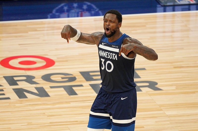May 24, 2025; Minneapolis, Minnesota, USA; Minnesota Timberwolves forward Julius Randle (30) reacts against the Oklahoma City Thunder during the second half in game three of the western conference finals for the 2025 NBA Playoffs at Target Center. Mandatory Credit: Brad Rempel-Imagn Images