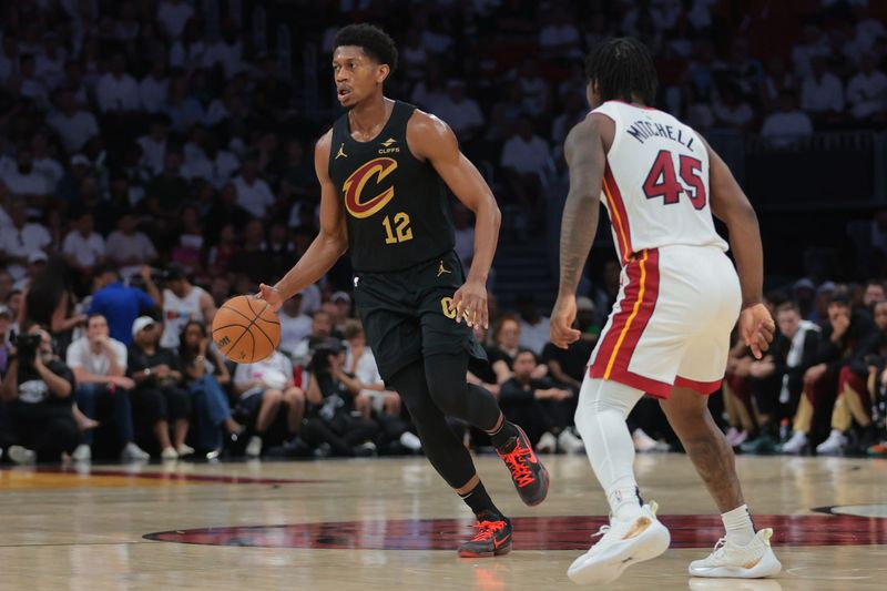 Apr 26, 2025; Miami, Florida, USA; Cleveland Cavaliers forward De'Andre Hunter (12) dribbles the basketball as Miami Heat guard Davion Mitchell (45) defends in the first quarter during game three for the first round of the 2025 NBA Playoffs at Kaseya Center. Mandatory Credit: Sam Navarro-Imagn Images