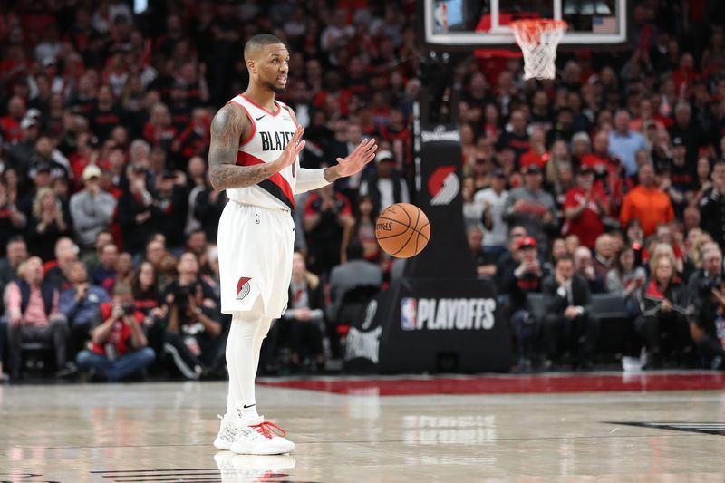 Apr 14, 2019; Portland, OR, USA; Portland Trail Blazers guard Damian Lillard (0) sets up the next play against the Oklahoma City Thunder in game one of the first round of the 2019 NBA Playoffs at Moda Center. Mandatory Credit: Jaime Valdez-USA TODAY Sports