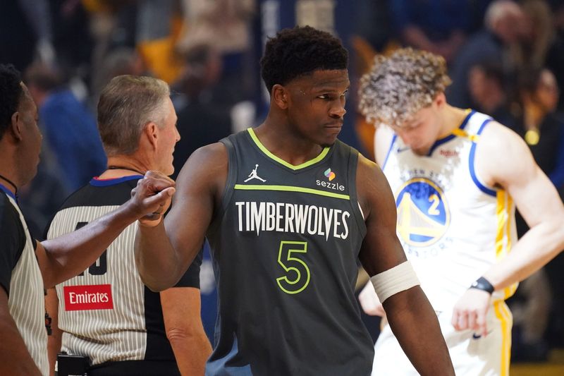 May 10, 2025; San Francisco, California, USA; Minnesota Timberwolves guard Anthony Edwards (5) gets ready for the start of the game against the Golden State Warriors during game three of the second round for the 2025 NBA Playoffs at Chase Center. Mandatory Credit: David Gonzales-Imagn Images