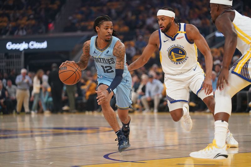 Apr 15, 2025; San Francisco, California, USA; Memphis Grizzlies guard Ja Morant (12) dribbles the ball in front of Golden State Warriors guard Moses Moody (4) in the first quarter at the Chase Center. Mandatory Credit: Cary Edmondson-Imagn Images