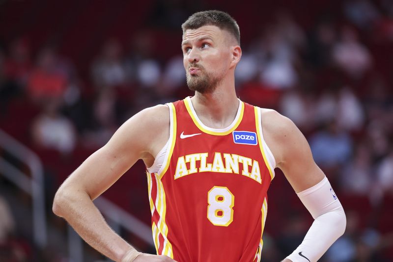 Oct 6, 2025; Houston, Texas, USA; Atlanta Hawks forward/center Kristaps Porzingis (8) reacts during the second quarter against the Houston Rockets at Toyota Center. Mandatory Credit: Troy Taormina-Imagn Images