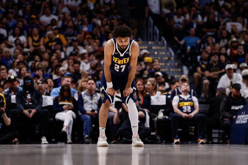 May 11, 2025; Denver, Colorado, USA; Denver Nuggets guard Jamal Murray (27) in the second quarter against the Oklahoma City Thunder during game four of the second round of the 2025 NBA Playoffs at Ball Arena. Mandatory Credit: Isaiah J. Downing-Imagn Images