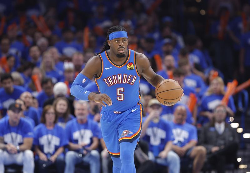 May 18, 2025; Oklahoma City, Oklahoma, USA; Oklahoma City Thunder guard Luguentz Dort (5) dribbles the ball down the court against the Denver Nuggets in the second half of game seven of the second round for the 2025 NBA Playoffs at Paycom Center. Mandatory Credit: Alonzo Adams-Imagn Images