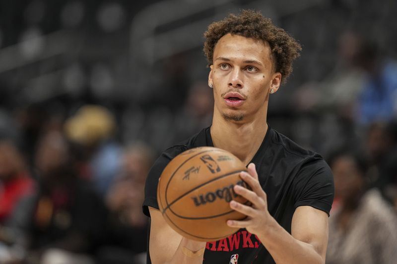 Apr 13, 2025; Atlanta, Georgia, USA; Atlanta Hawks guard Dyson Daniels (5) warms up on the court prior to the game against the Orlando Magic at State Farm Arena. Mandatory Credit: Dale Zanine-Imagn Images