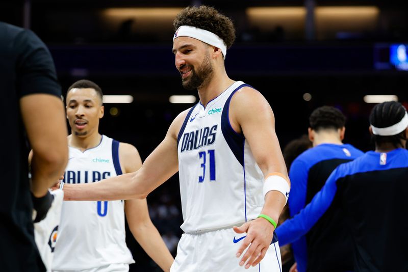 Apr 16, 2025; Sacramento, California, USA; Dallas Mavericks guard Klay Thompson (31) celebrates with teammates after exciting the court during the fourth quarter against the Sacramento Kings at Golden 1 Center. Mandatory Credit: Sergio Estrada-Imagn Images