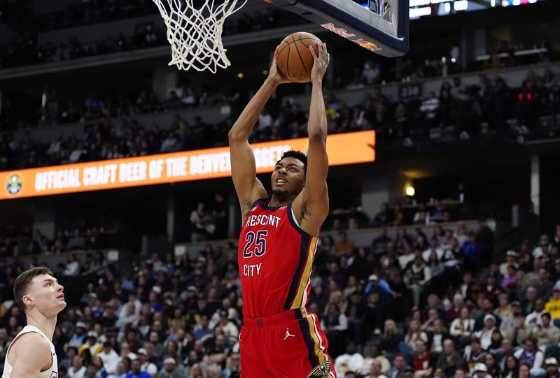 Feb 5, 2025; Denver, Colorado, USA; New Orleans Pelicans guard Trey Murphy III (25) finishes off a basket in the second quarter against the Denver Nuggets at Ball Arena. Mandatory Credit: Ron Chenoy-Imagn Images