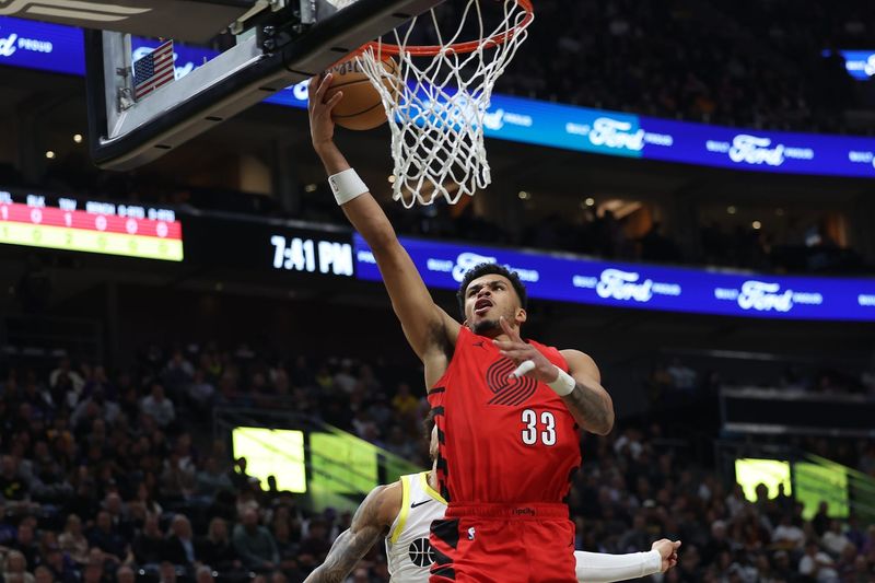 Dec 2, 2023; Salt Lake City, Utah, USA; Portland Trail Blazers forward Toumani Camara (33) lays the ball up against the Utah Jazz during the first quarter at Delta Center. Mandatory Credit: Rob Gray-USA TODAY Sports