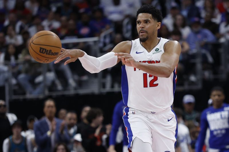 Apr 24, 2025; Detroit, Michigan, USA; Detroit Pistons forward Tobias Harris (12) passes in the second half against the New York Knicks during game three of first round for the 2024 NBA Playoffs at Little Caesars Arena. Mandatory Credit: Rick Osentoski-Imagn Images