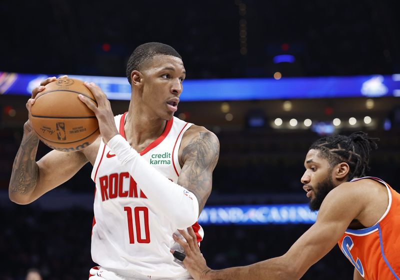 Feb 27, 2024; Oklahoma City, Oklahoma, USA; Houston Rockets forward Jabari Smith Jr. (10) moves the ball against Oklahoma City Thunder guard Isaiah Joe (11) during the second half at Paycom Center. Mandatory Credit: Alonzo Adams-USA TODAY Sports
