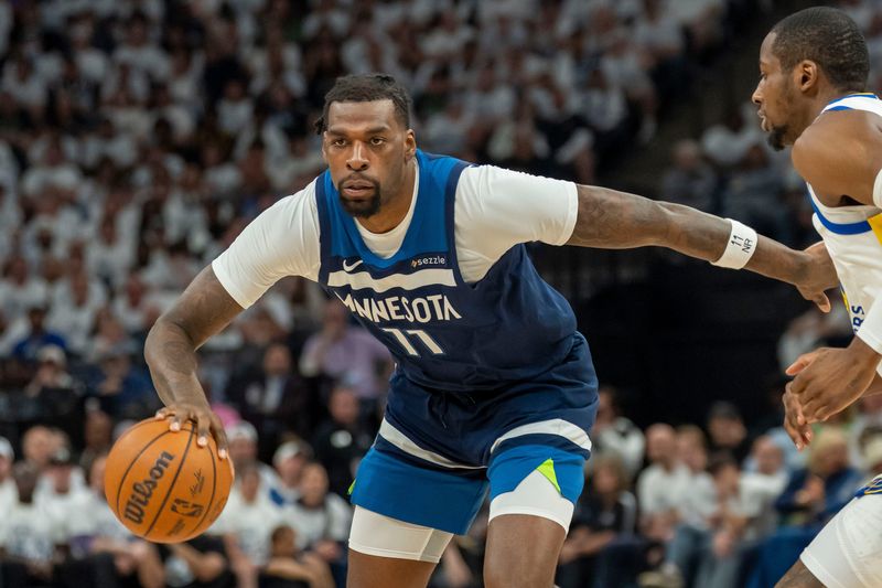 May 14, 2025; Minneapolis, Minnesota, USA; Minnesota Timberwolves center Naz Reid (11) dribbles the ball against the Golden State Warriors in the first half during game five of the second round for the 2025 NBA Playoffs at Target Center. Mandatory Credit: Jesse Johnson-Imagn Images