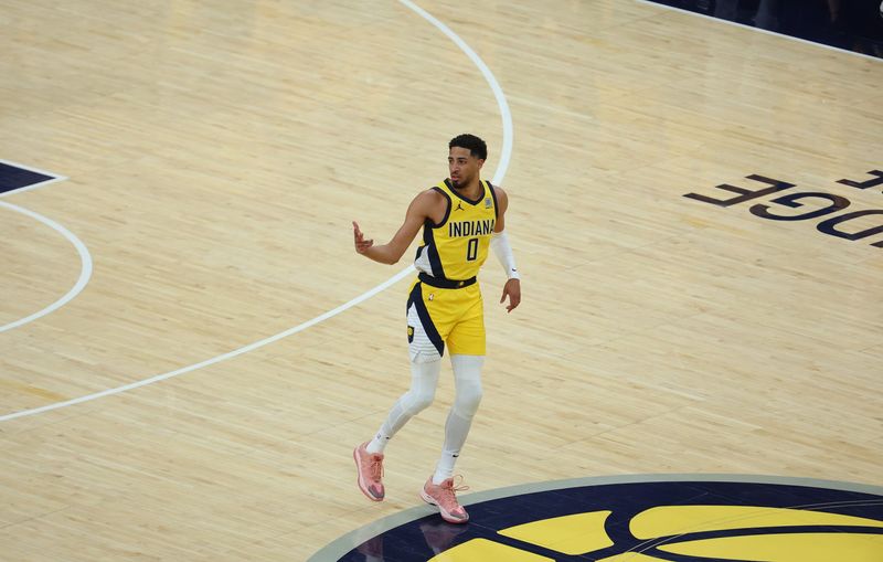 Jun 13, 2025; Indianapolis, Indiana, USA; Indiana Pacers guard Tyrese Haliburton (0) reacts during the first quarter of game four of the 2025 NBA Finals against the Oklahoma City Thunder at Gainbridge Fieldhouse. Mandatory Credit: Trevor Ruszkowski-Imagn Images