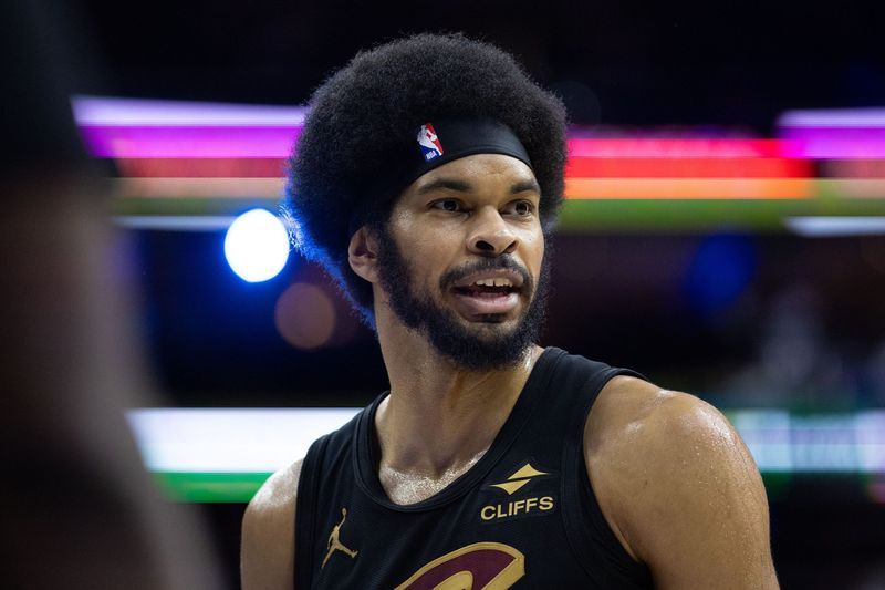 Jan 24, 2025; Philadelphia, Pennsylvania, USA; Cleveland Cavaliers center Jarrett Allen in a game against the Philadelphia 76ers at Wells Fargo Center. Mandatory Credit: Bill Streicher-Imagn Images