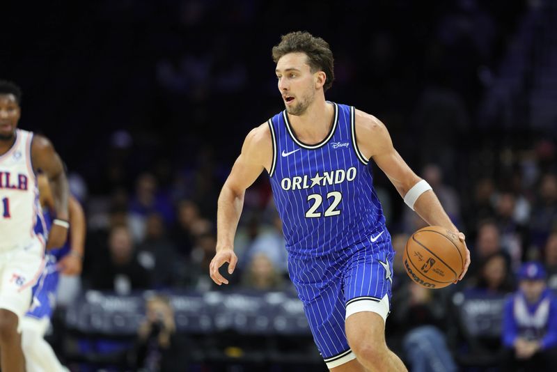 Oct 10, 2025; Philadelphia, Pennsylvania, USA; Orlando Magic forward Franz Wagner (22) dribbles the ball against the Philadelphia 76ers during the third quarter at Xfinity Mobile Arena. Mandatory Credit: Bill Streicher-Imagn Images