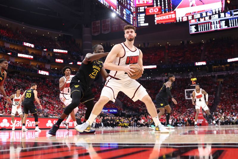 May 4, 2025; Houston, Texas, USA; Golden State Warriors forward Draymond Green (23) defends against Houston Rockets center Alperen Sengun (28) during game seven of the first round for the 2025 NBA Playoffs at Toyota Center. Mandatory Credit: Troy Taormina-Imagn Images