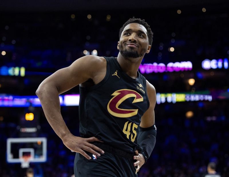Jan 24, 2025; Philadelphia, Pennsylvania, USA; Cleveland Cavaliers guard Donovan Mitchell (45) looks on after committing a foul in the final minute against the Philadelphia 76ers at Wells Fargo Center. Mandatory Credit: Bill Streicher-Imagn Images