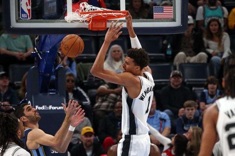 Feb 3, 2025; Memphis, Tennessee, USA; San Antonio Spurs center Victor Wembanyama (1) dunks during the first quarter against the Memphis Grizzlies at FedExForum. Mandatory Credit: Petre Thomas-Imagn Images