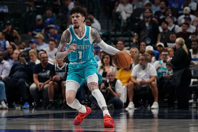 Oct 11, 2025; Dallas, Texas, USA; Charlotte Hornets guard Lamelo Ball (1) brings the ball up court against the Dallas Mavericks in the first half of a game at American Airlines Center. Mandatory Credit: Raymond Carlin III-Imagn Images