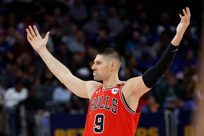 Feb 2, 2025; Detroit, Michigan, USA; Chicago Bulls center Nikola Vucevic (9) reacts in the first half against the Detroit Pistons at Little Caesars Arena. Mandatory Credit: Rick Osentoski-Imagn Images
