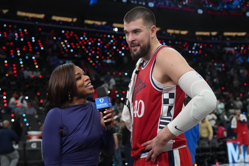 Apr 8, 2025; Inglewood, California, USA; FanDuel Sports Network reporter Kristina Pink (left) interviews LA Clippers center Ivica Zubac (40) atter the game against the San Antonio Spurs at the Intuit Dome. Mandatory Credit: Kirby Lee-Imagn Images