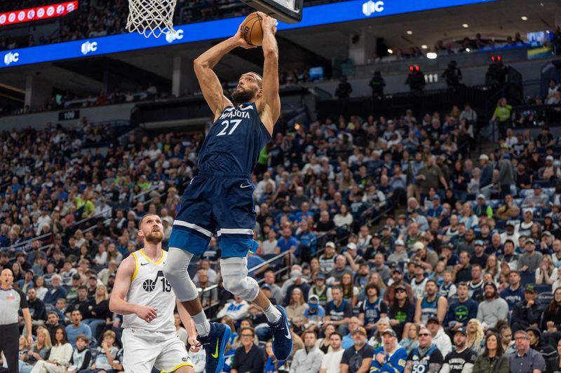 Apr 13, 2025; Minneapolis, Minnesota, USA; Minnesota Timberwolves center Rudy Gobert (27) dunks the ball against the Utah Jazz in the second quarter at Target Center. Mandatory Credit: Matt Blewett-Imagn Images