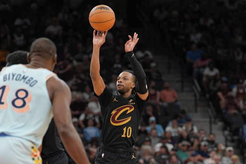 Apr 4, 2025; San Antonio, Texas, USA; Cleveland Cavaliers guard Darius Garland (10) shoots in the first half against the San Antonio Spurs at Frost Bank Center. Mandatory Credit: Daniel Dunn-Imagn Images