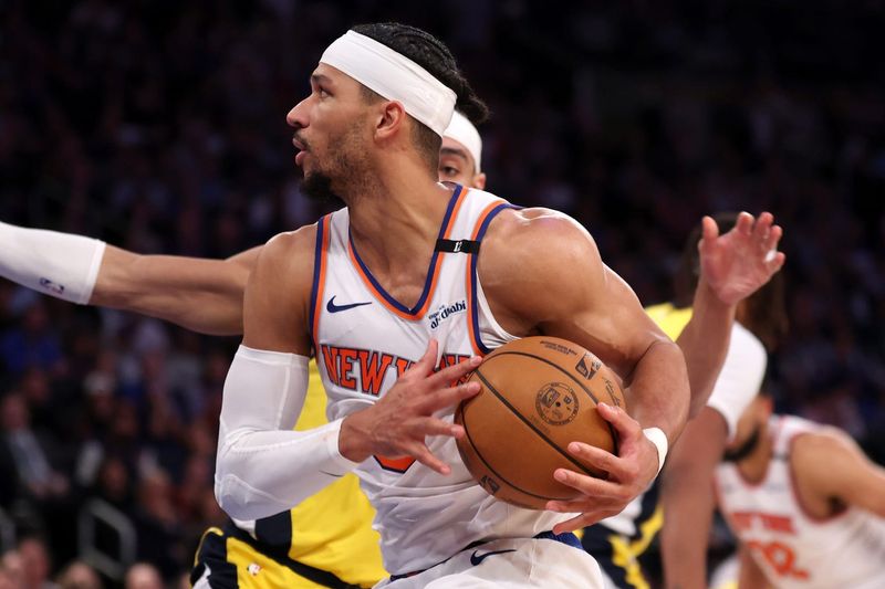 May 29, 2025; New York, New York, USA; New York Knicks guard Josh Hart (3) controls the ball against the Indiana Pacers in the fourth quarter during game five of the eastern conference finals for the 2025 NBA Playoffs at Madison Square Garden. Mandatory Credit: Vincent Carchietta-Imagn Images