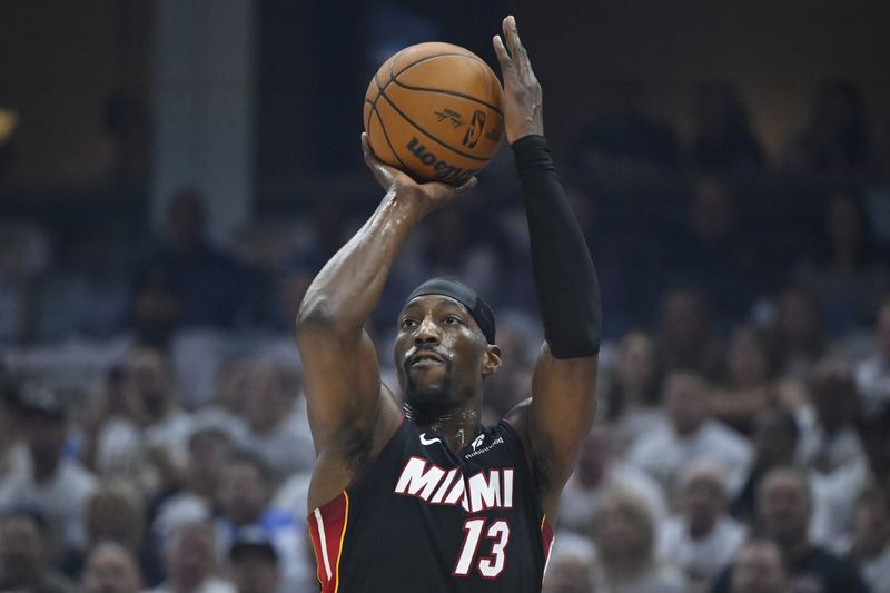 Apr 23, 2025; Cleveland, Ohio, USA; Miami Heat center Bam Adebayo (13) shoots in the first quarter of game two of the first round of the 2025 NBA Playoffs against the Cleveland Cavaliers at Rocket Arena. Mandatory Credit: David Richard-Imagn Images